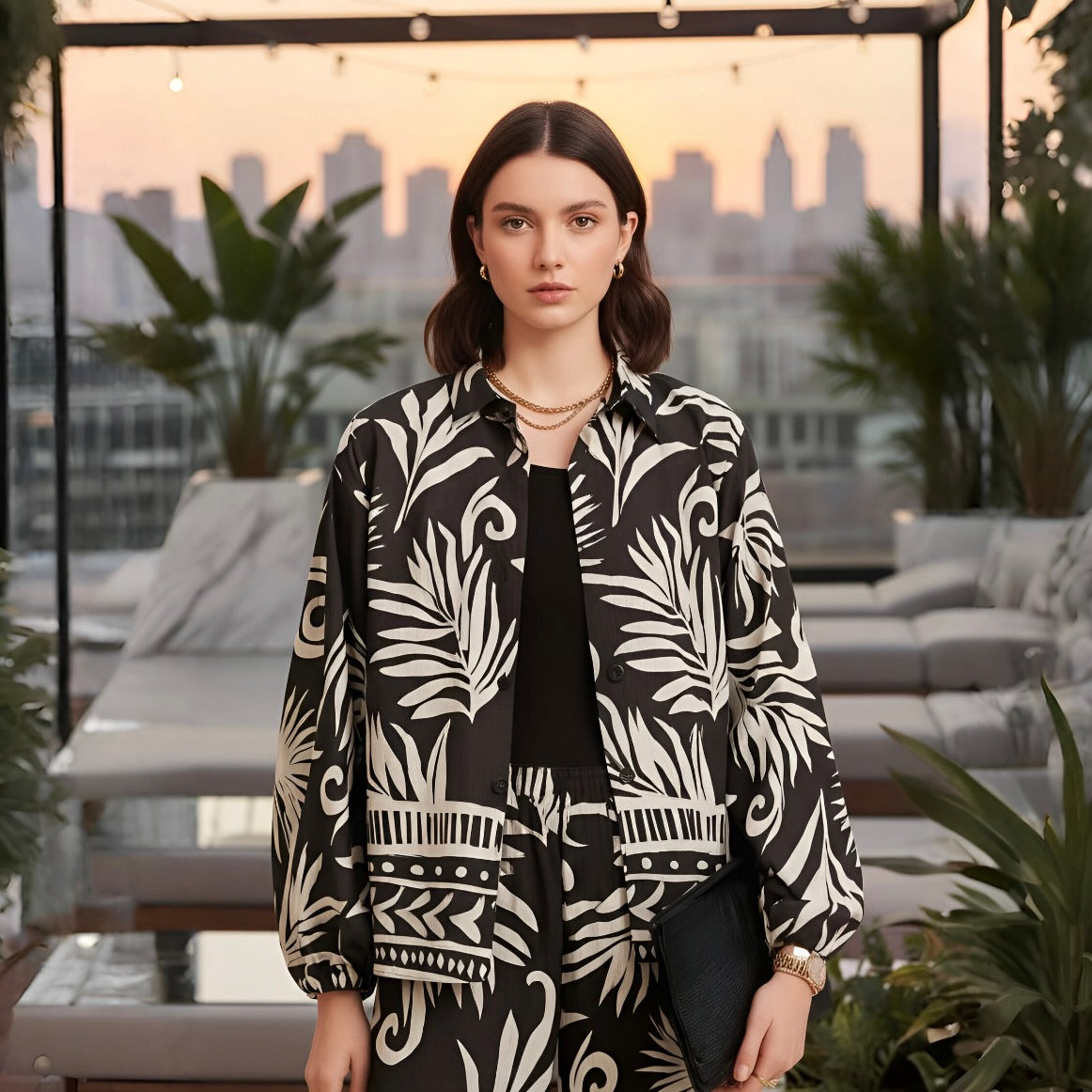 One-Shoulder Bodysuit with Tropical Print Wide-Leg Palazzo
