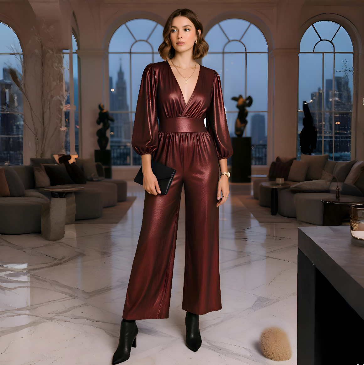Metallic Wrap V-Neck Puff Sleeve Peplum Jumpsuit